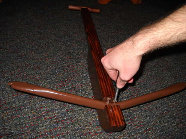 Encuentra la revista en el stock, deslice la palanca sobre la que alinee los agujeros y coloque los pernos a través (no es necesario poner las tuercas ahora mismo). Entonces el arco de cadena y empuje la palanca hacia adelante hasta que enganche en la ranura a través de la flecha. Tire la palanca hacia atrás. Usted notará inmediatamente que no se dispara. No te preocupes no engañarle. Deje la palanca hacia adelante y empuja la cadena fuera de la ranura con los pulgares. Ahora todo lo que necesita hacer para terminar el mecanismo es lijar los bordes delanteros de la muesca (la cadena de las capturas en uno) suave y vuelta apagado. Seguir haciendo la prueba con la palanca hasta que usted lo consigue lija lisa para donde disparar. Ahora ya está hecho!