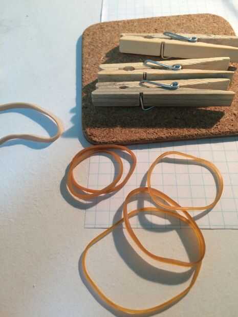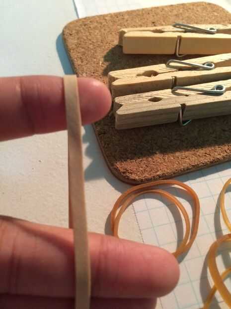 Necesita 3 pinzas y 6 bandas de caucho. Y que debe ser del tamaño de una de las 6 bandas de caucho.