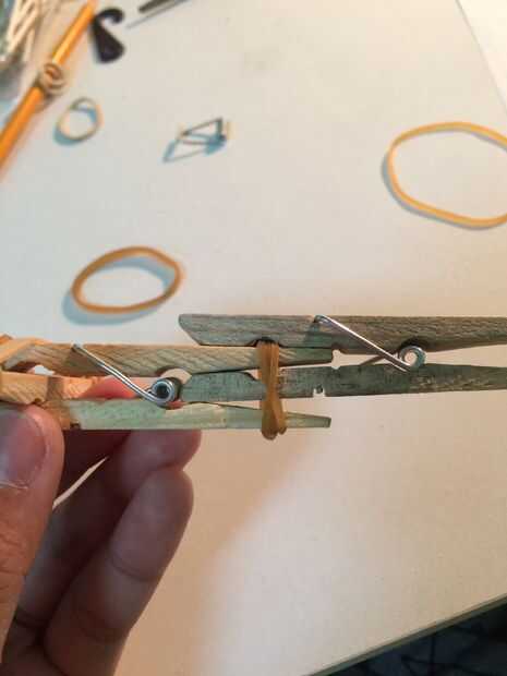 Una banda de goma y atarla al final de la segunda pieza y colocar la tercera pieza en el medio. Tienes tu ballesta mini pinza para la ropa.