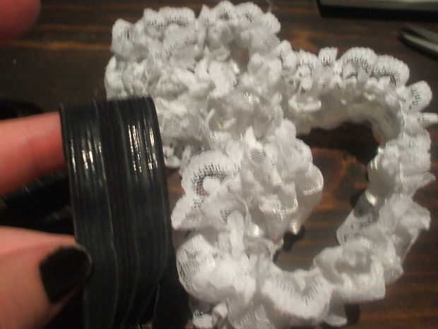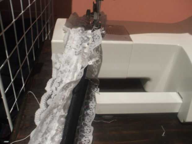 Coser la banda a la encaje forma sería coser elástico en un dobladillo. Uso una puntada de Zig zag y tirar de su silicona banda y como cosen.