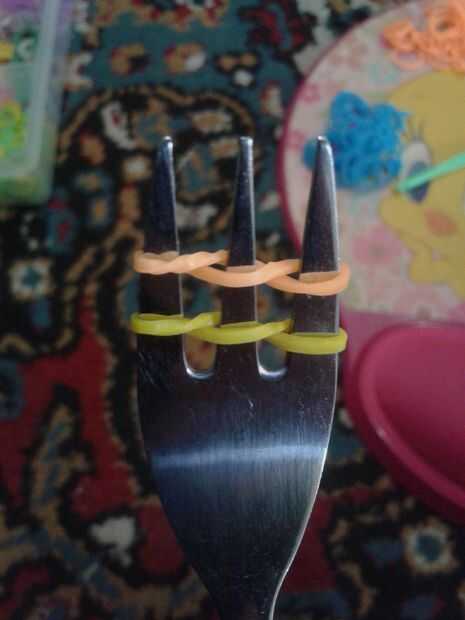 Esta es la pulsera como se verá cuando esté terminado. Yo recomiendo usar 3 colores diferentes para esta pulsera. Antes de poner las bandas en el paso siguiente Asegúrese de que doble todas las bandas, si crees que me refiero a hacer una banda de la