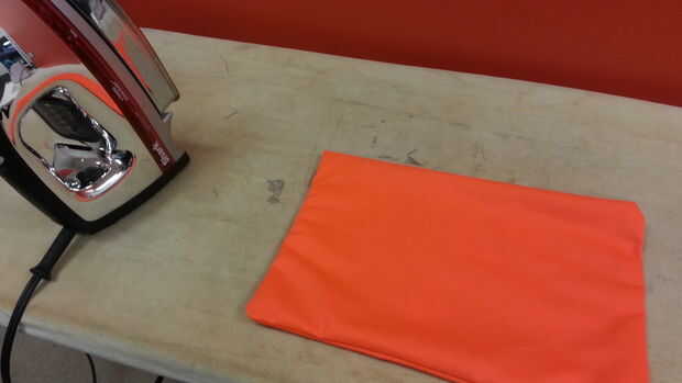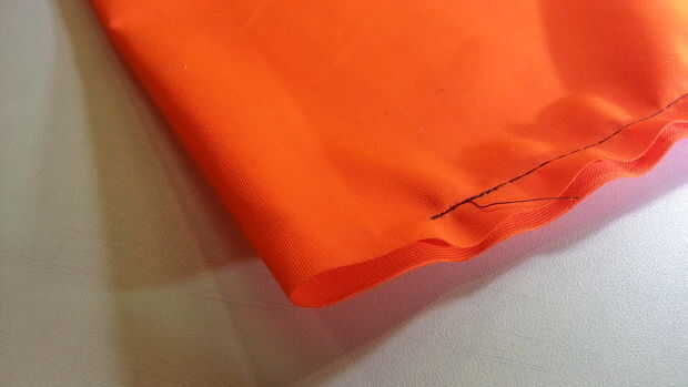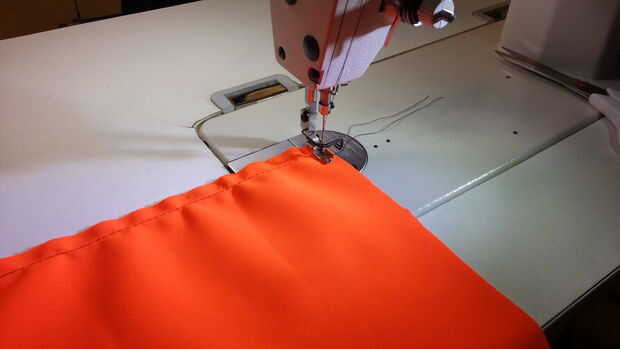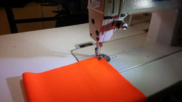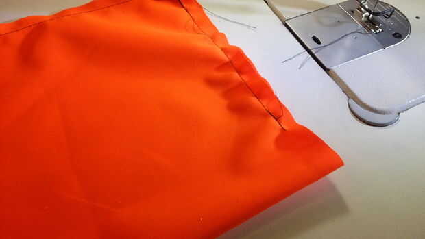 Doblar por la mitad con el lado brillante hacia dentro. Coser los 3 bordes, dejando una de las esquinas abiertas. Tirar la bandera de adentro hacia fuera, exponiendo el lado brillante del material.