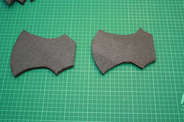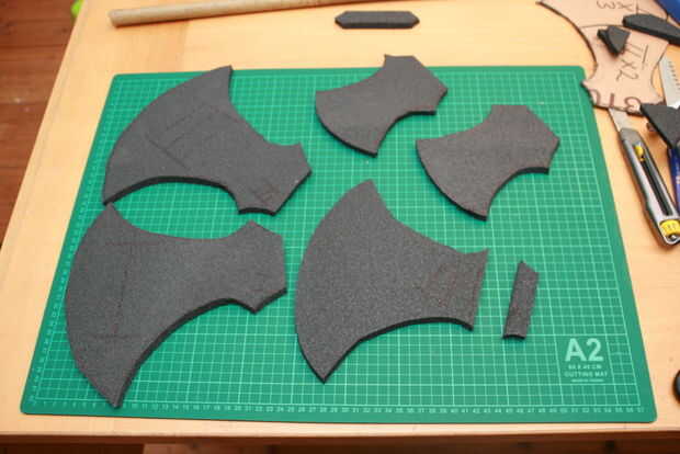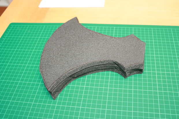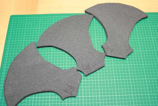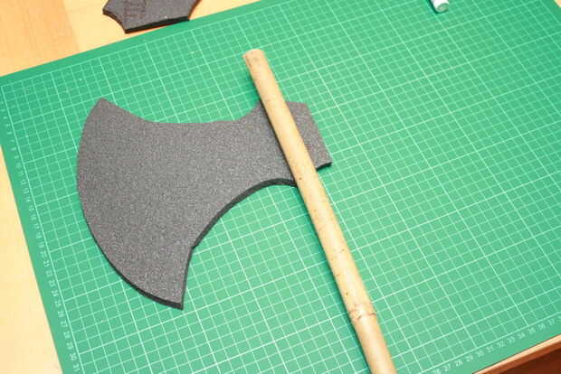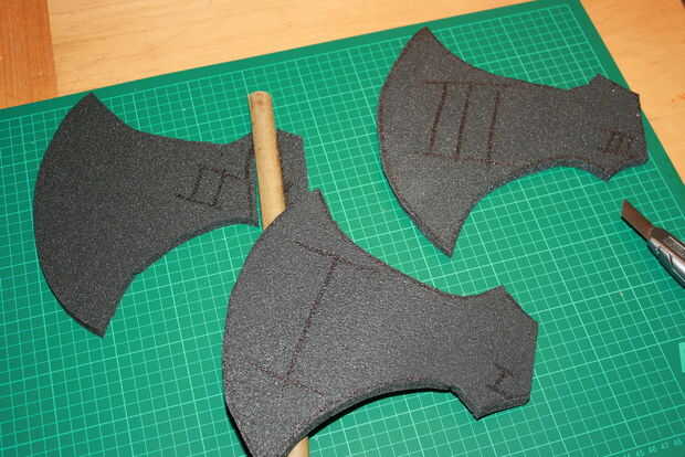 Now draw the axe 3 times. Y los pedazos más pequeños 2 veces en la espuma. Preste atención a la colocación de las piezas para que no pierda gran parte de la colchoneta. Si la palanca de la manija es larga, ahora es el momento de corte en longitud. Sin duda las piezas termina los lugares correctos pongo números en ellos. En la pieza 2 cortar un agujero para la manija.