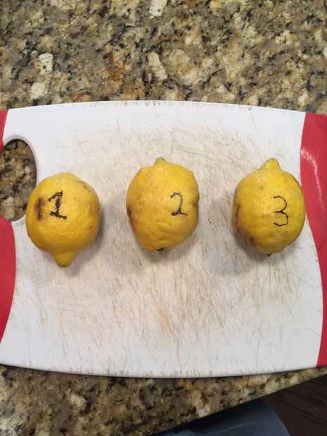 Extiende tus limones sobre una superficie plana (no es necesario, pero resulta más fácil). Etiqueta tus limones 1, 2 y 3, luego que los ponen en orden. Esto hace más fácil seguir las siguientes instrucciones.