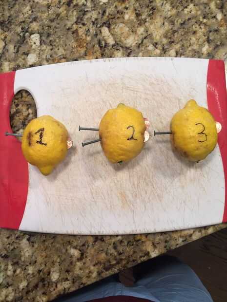 Meter un clavo en el lado izquierdo del número 3 de limón. Entonces meter un centavo en el lado opuesto de la uña en el número 3 de limón. Esto hace que el circuito a través de todos los limones una vez que se unen los cables de cobre.