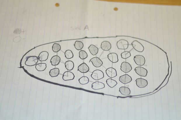 Para decidir el orden de las celdas, simplemente comencé en el extremo pequeño de la bolsa y nombró el primer conjunto de 3 células "Grupo 1". Entonces dibujé una línea que conecta la parte superior (positivo) de esas células a la negativa de la sesión de grupo de la célula al lado de ellos. Por eso la mitad de las células están boca abajo, para que los aspectos positivos y negativos de grupos adyacentes pueden ser conectados en serie.