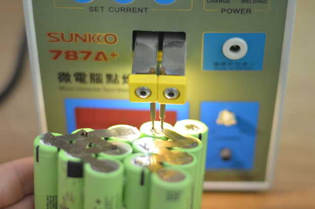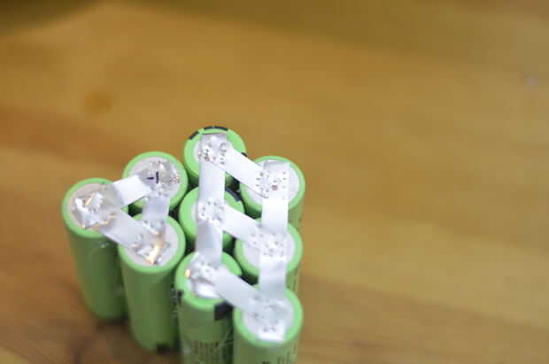 Pongo sobre 6 o 8 punto de soldadura puntos en cada célula para cada capa de la tira de níquel. La tira de níquel que usé es 7mm de ancho y 0,15 mm de espesor. Tuve al menos 5 piezas de tira de níquel conectar cada grupo en serie por lo que había mucho material para la corriente fluya a través. Algunas personas conectan todas sus células en paralelo y luego sólo tiene que utilizar una sola tira de níquel para hacer la conexión de serie pero esta es una mala idea. Es el resultado de toda la actual tratando de meter su camino a través de una pieza única y delgada de níquel. Es mejor poner muchas tiras de níquel apilados uno encima del otro para las conexiones serie. Piense en ello como un camino. Una sola tira de níquel es como un carril de la calle y 5 piezas de níquel apilados uno encima del otro son como una autopista de 5 carriles - la autopista puede manejar mucho más tráfico de comprimir por ella!