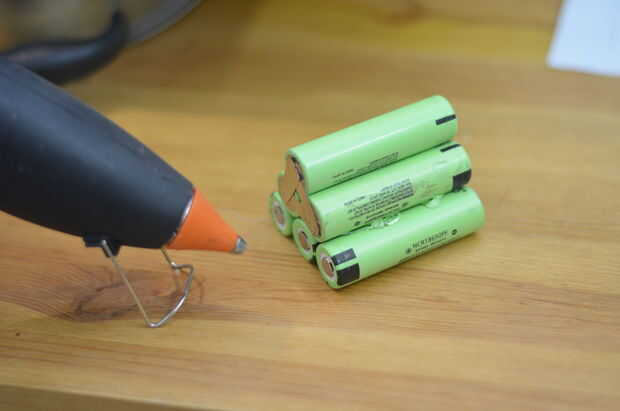 Ahora estás listo para comenzar a armar tu paquete. Dependiendo del tamaño y forma del paquete, va a cualquier salida por soldadura o pegado en caliente. El primer grupo paralelo en mi paquete fue arreglado en un triángulo, así que empecé por pegar a las células, entonces lugarles soldó con autógena.