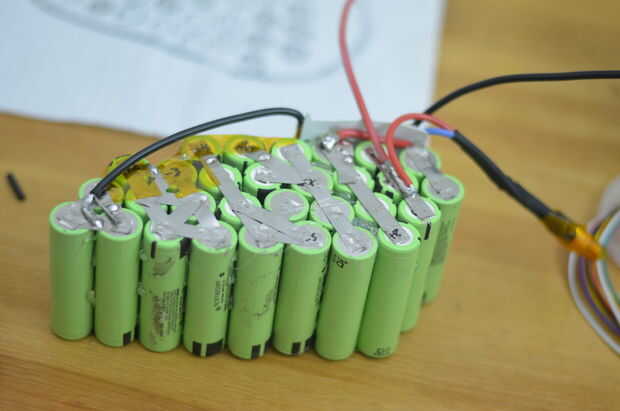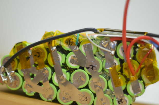 A continuación había soldado todos los cables de célula pequeña (10 en total) para el BMS. Cada uno se marca 1 + a 10 + para saber donde soldar cada uno. Nota que había soldado a la placa de níquel entre las células y no sobre una célula. Esto ayudó a mantener como mucho calor fuera de las células como sea posible - no quieres calentar las células ellos mismos si puede evitarlo.