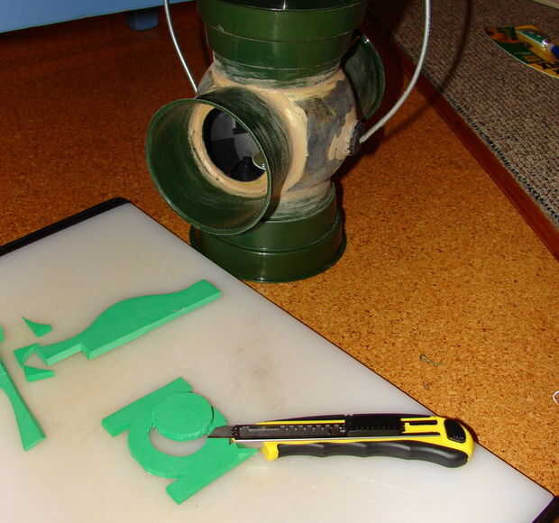 Cortar un linterna verde con un cuchillo el símbolo y péguelo en el cono superior (orientación del partido con la linterna sí mismo). Le sugiero imprimir el símbolo y pegar el símbolo a la espuma como una guía de plantilla.