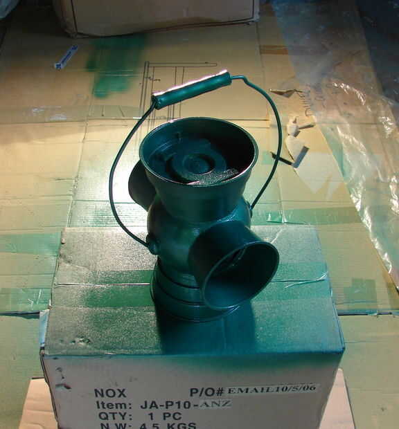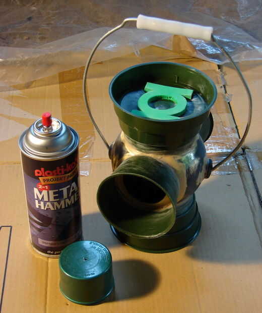 Colocar la linterna en una caja o colgarse de algo antes de pintar. Pintura en aerosol consigue en todas partes tal vez hacer esto en su garage o en algún lugar resguardado fuera. Yo sugiero usar una máscara y tal vez protección de ojo. Mantenga la lata de spray sobre un pie lejos de la linterna (es mejor hacer muchas capas finas que una pesada). Recomiendo usar pintura de aerosol de efecto de martillo de metal verde bosque.