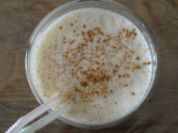 Transferir a un vaso, añadir dos pajas y espolvoree con canela para decorar.