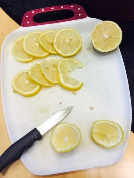Ahora reducir a la mitad todos los sectores de limón fino-cortó en dos mitad rebanadas cortando cada rebanada fina todo abajo del medio.
