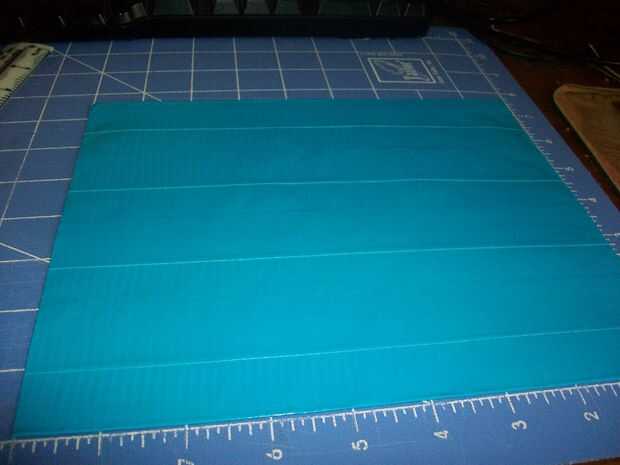 cuadro 1: necesita hacer una cinta de ducto cinta "tela" es de 9 pulgadas de ancho y 7 1/2 pulgadas de alto. Se puede ver que utilicé las líneas en mi estera de corte para ayudar a medir así que si tienes una que ayudará a muchos. Asegúrese de que usted comienza con una tira más de 9 pulgadas de largo. Así que tome una tira de cinta adhesiva y cortar para que sea un más largo de 9 pulgadas. Luego Dale la vuelta para que el lado adhesivo quede hacia arriba.