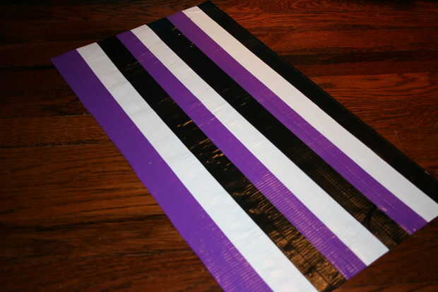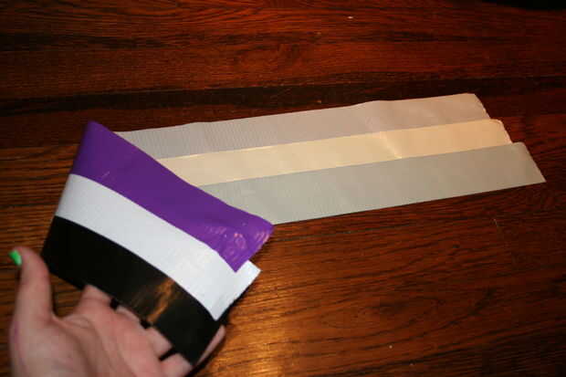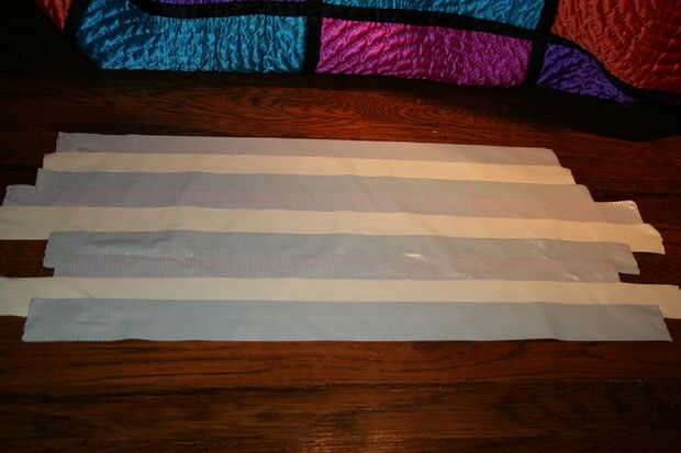 -Repita el proceso y vuelta sobre los pedazos de cinta adhesiva. No olvide alternar los colores. Cuando se tienen 9 piezas de cinta conectados juntos hacer lo mismo pero Coloque el lado pegajoso de la cinta por encima de las piezas que sólo ha conectado juntos. Deja sobre un centímetro de lado pegajoso hacia abajo en la parte superior.