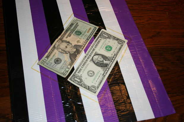 - Con un empate de pluma media pulgada más de su longitud de billetes dólares y ancho en la tela de la cinta de conducto. -Corte alrededor del borde de la línea de salida asegurándose de no cortar directamente sobre la línea de lápiz. -El patrón debe ser diagonal.