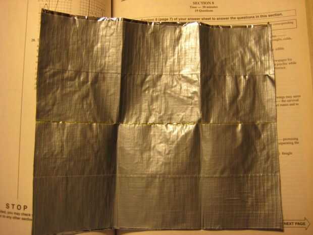 Para este paso, quiere cortar el diseño de su cartera. Usted sólo la cinta de la cinta y pega sobre el diseño de su cubierta previsto. Sugiero algo resistente como papel de regalo metalizado que usé aquí. Cometí un error tonto cortando sólo un rectángulo grande en lugar de agregar las aletas. Hice un cuadro, pero revisa los otros tutoriales de billetera de cinta de conducto y verás lo que quiero decir. Acaba de tomar alguna cinta para hacer una pieza de tela de la cinta dos veces tan alta como debería ser por lo que sólo puedo doblarlo sobre. Aviso que he añadido un pequeño boquete en el medio para que la cartera se dobla más fácil.