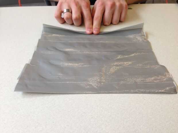 Repetir este proceso hasta que la hoja de 8 pulgadas de alto. Luego doblar los extremos pegajosos restantes sobre para que la hoja es totalmente vinilo en ambos lados (con sin rostro pegajoso mostrando).