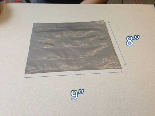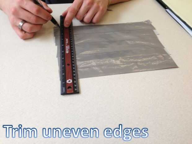 Ahora usted debe tener una hoja de cinta que es de aproximadamente 10 "x 8". El siguiente paso es recortar los bordes de la hoja, por lo que debe medir 9 "x 8". La hoja debe tener ahora todos los bordes rectos.