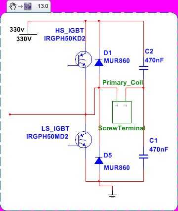 Como soy consciente de la SSTC utilizan la misma idea de cualquier medio puente o puente completo de transistores para conmutar la corriente por la bobina primaria. He utilizado un medio puente (porque es más barato, sólo necesitas dos IGBTs en lugar de 4) y a hablar que uno en vez del puente completo.