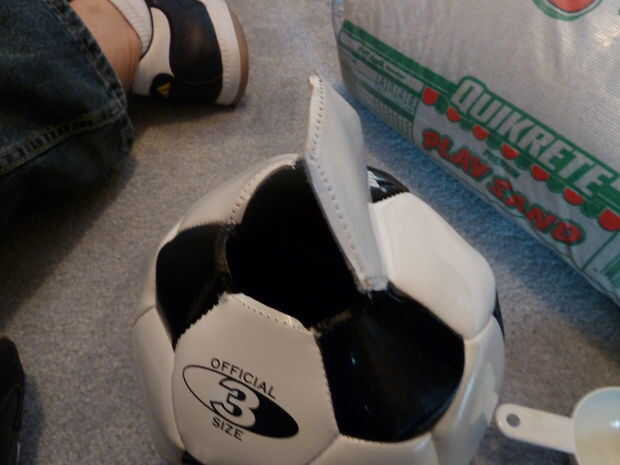 Una vez haya realizado su aleta, mientras que el balón se infla, corte sobre 1" raja la vejiga interior de la pelota de fútbol. Que sea lo suficientemente grande como para que usted puede insertar su embudo, pero no demasiado grande (tenemos que cerrar hacia arriba en el extremo). Trate de no poner los dedos en el agujero para coger la bola por cualquier motivo - que hizo esto e hizo el corte propagar otro pulgadas par, haciendo mi servicio de trabajo más de una molestia.
