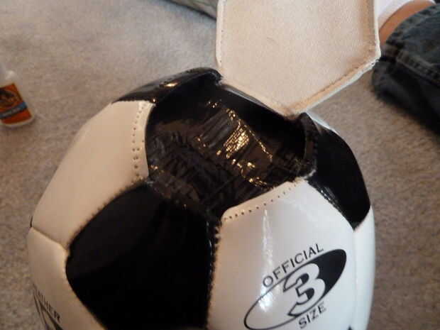 Una vez que la bola casi en su totalidad llena (tan completo como usted lo desea), utilice una toalla de papel húmeda para limpiar el polvo de la vejiga y deje que se seque. Intente establecer la costura cortar la vejiga juntos así que no tienes que mantenerla y luego aplique su pegamento, pegamento de caucho o kit de reparación de tubo de bicicleta, según las instrucciones. Para ayudarte en este paso si utiliza el pegamento (y tal vez el cemento de goma), es colocar un pañuelo sobre el pegamento. Esto ayudará a acelerar el curado, así como la celebración de la raja cerrada como cura.