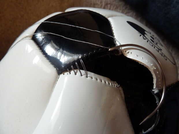 El paso final es también el más lento y tedioso. Tómese su tiempo cuando cose el colgajo hacia abajo sobre la pelota, será la única parte que puede ver cuando hayas terminado, por lo que debe tener buen aspecto, pero también está el riesgo eso si pones la aguja demasiado profundo en la bola que perforar la vejiga interna y hacer un agujero para la arena a perder. Usé una aguja curva resistente que se muestra en la foto y sobre 6 pies (3 pies de longitud doble) hilo de tapicería. Poner un gran nudo en el extremo después de enhebrar la aguja para no tirar a través. Básicamente traté de usar todos los mismos agujeros de la costura original cuando fui a través de, un patrón de costura básico es todo lo que necesitas (no creo que se puede hacer mucho más simple que hice, solo una sola pasada va de un agujero al siguiente). Asegúrese de que un nudo bien cuando termines para no desatar y ¡ listo!