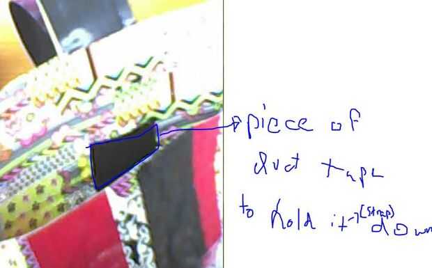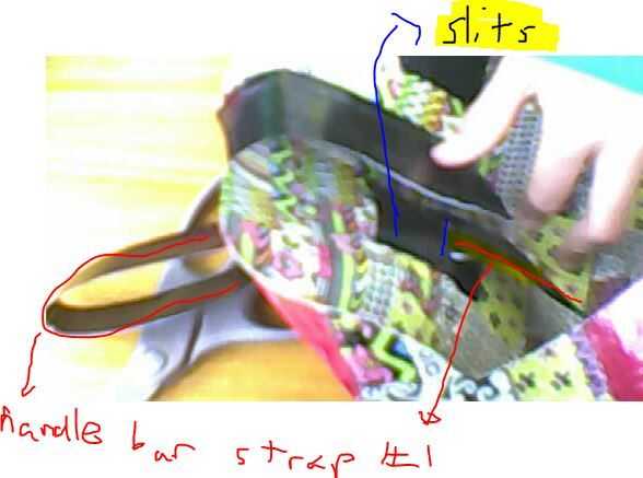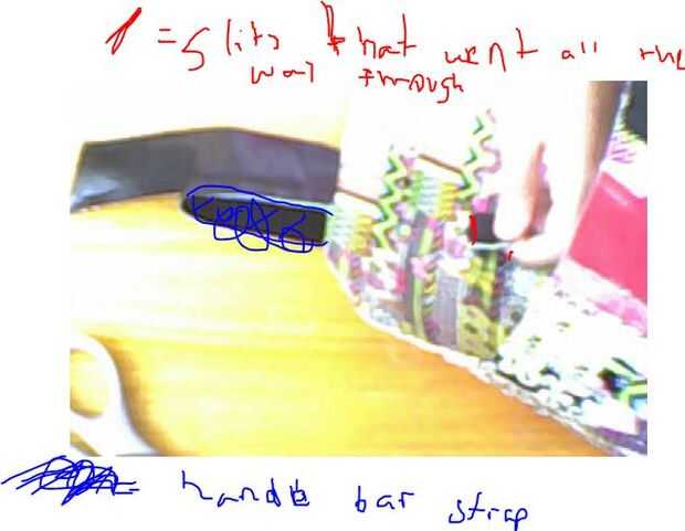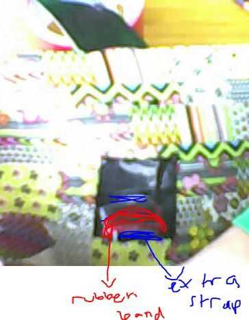 Desde dentro de la bolsa, seguro las correas del manillar en la parte posterior de la bolsa, con piezas adicionales de cinta del conducto. Entonces, puso toque el extra del palo de cintas de manillar hacia fuera a través de la ranura de la parte inferior, por lo que viene por el interior. Luego, enrollar ese pedacito y asegurarlo con una banda elástica, por lo que se puede apretar o aflojar la cinta de manillar cuando quieras. Repita el procedimiento en ambas cintas de manillar.