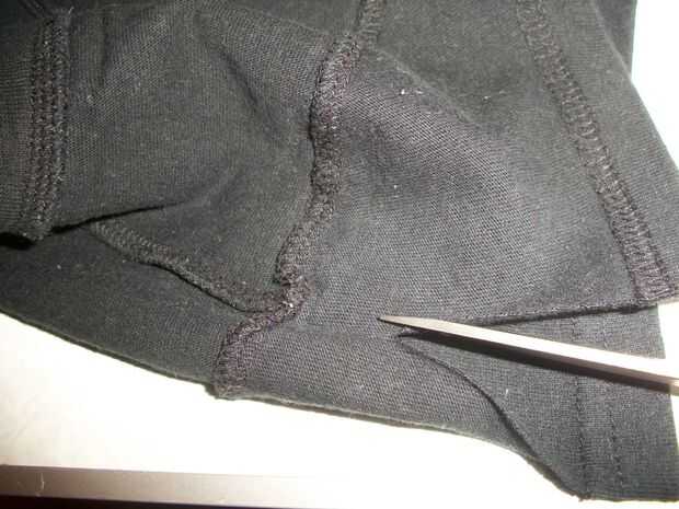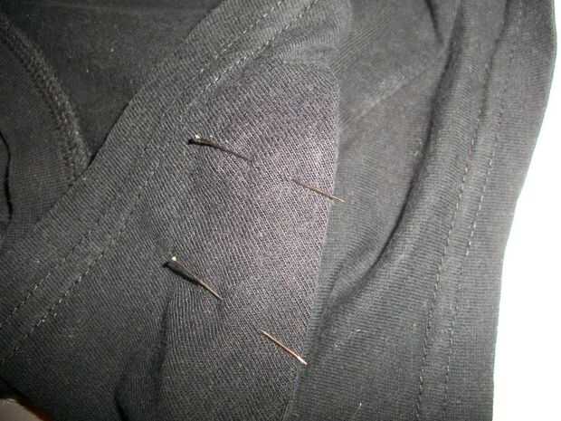 Ahora doble la parte de lado de 2cm de la tela y del perno a la pieza grande de la camiseta. Trate de prender las dos capas como plana juntos como sea posible por lo que no hay golpes cuando lo cosa más adelante. Asegúrese de que se doble en la costura por lo que forma un borde limpio agradable al final.
