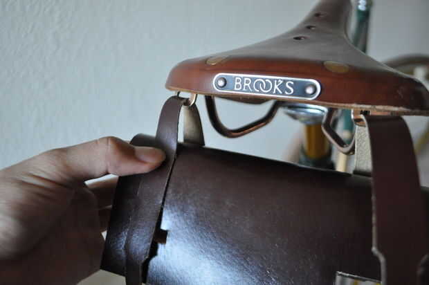 Ahora, usted puede montar su bolso sobre la silla de montar. Jale el extremo suelto de las correas a través de los ojos de montaje y luego virar luego las correas hacia abajo otra vez a la tapa donde apunta mi dedo pulgar (ver Fig. 2).