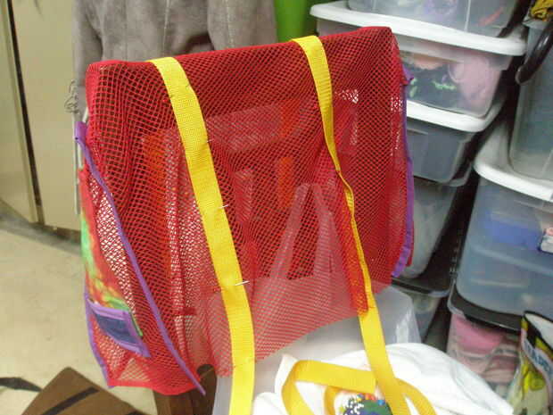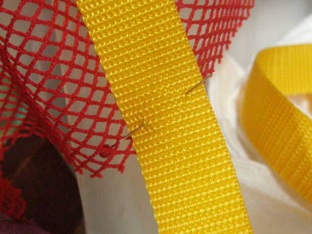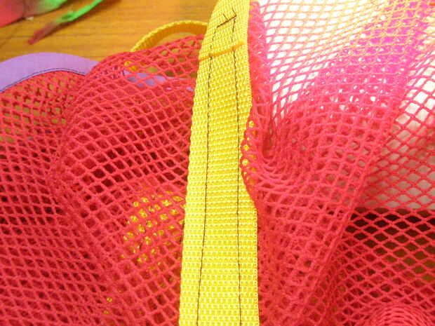 Desde esta malla es ligeramente elástico, que sabía que no podía apenas poner manijas en como me normalmente porque toda la bolsa se estira hacia fuera, así que hice las asas de un gran bucle de cinta alcanzado debajo de la bolsa y pesaba sobre molesté lados formando asas. Usted puede decidir cuánto las manijas son y exactamente donde quieres, pero yo recomendaría correr debajo de la bolsa para evitar que la malla que se extiende demasiado. Perno de la cinta en su lugar y coser hacia abajo usando dos costuras.