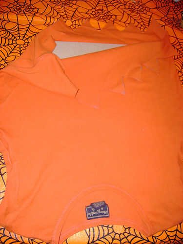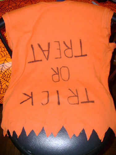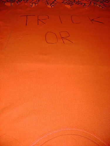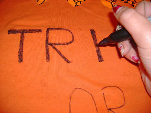6. Coloque un trozo de cartón dentro de la camisa. Trabajar con el filo en la parte superior. Escriba "Trick or Treat" en marcador negro.