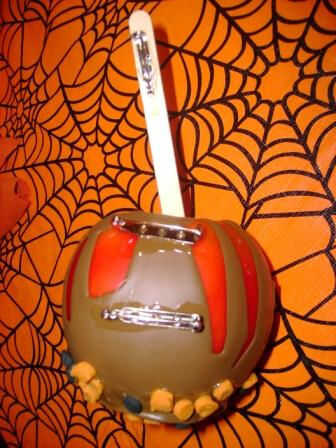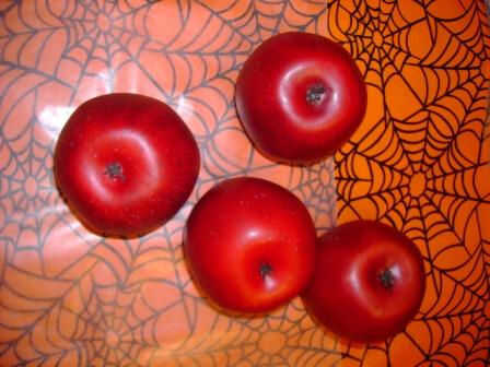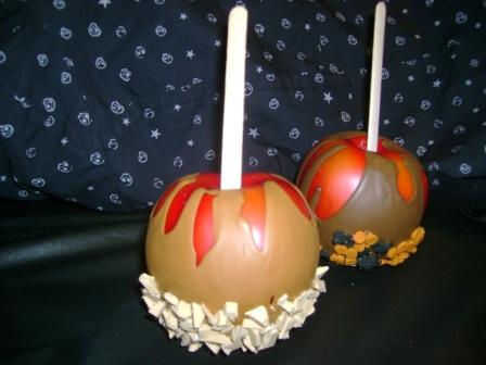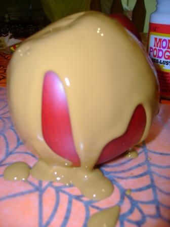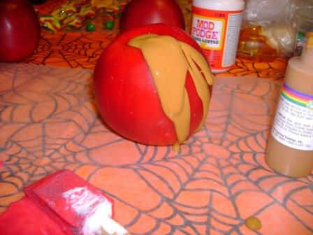 1. Vierta pintura color chocolate, cereza y caramelo sobre las manzanas falsas.