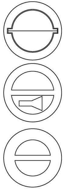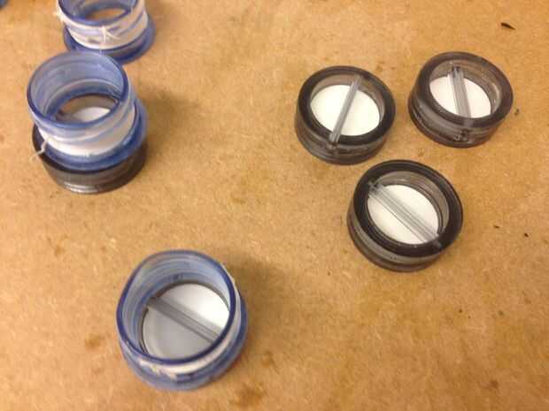 Las válvulas de aleta dos partes fueron diseñadas para caber los tapones de botellas que estábamos usando como el sistema de fijación de la tubería. Ya que teníamos todas las válvulas a ser lo mismo, teníamos láser de acrílico de 3mm y estireno 0,5 mm.
