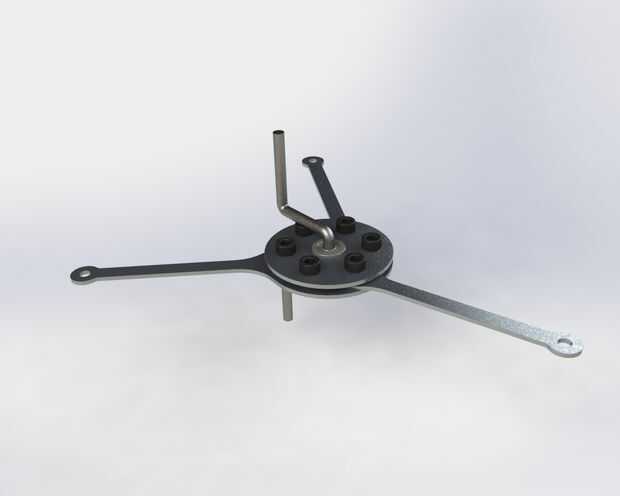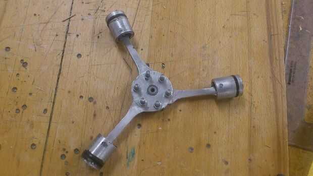 Comenzamos la construcción mediante la construcción de la varilla de manivela de maestro/esclavo. Esto fue hecha fuera de la hoja de aluminio. Dos barras de esclavos fueron cortadas, una barra principal (que era esencialmente la varilla auxiliar, pero con un círculo más grande en un extremo de él) y una placa espaciador. Las placas distanciadoras y el círculo iban a formar el eje central del arreglo del cigüeñal. Cada pieza tenía un agujero de 12mm perforado en el medio y seis más pequeños agujeros perforados alrededor de él, igualmente espaciados para tomar los pernos que mantienen unidas las barras de esclavo y todo el conjunto.