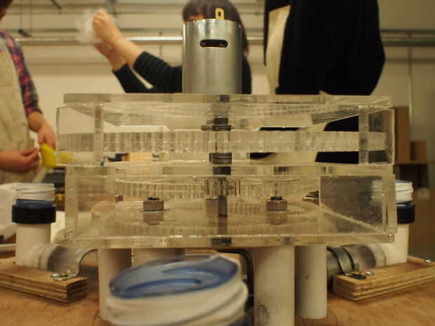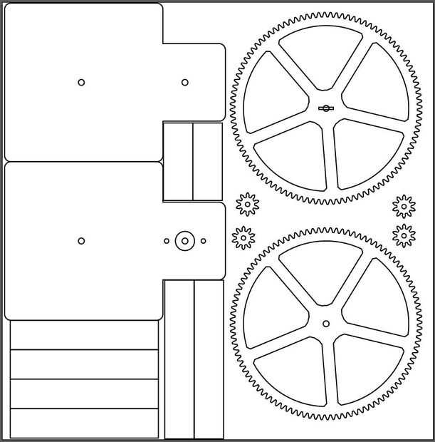 Los engranajes fueron diseñados en un programa de generación de engranajes y portados en Adobe Illustrator, en el que también hemos creado el patrón para cada capa de caja de cambios. Láser de corte el patrón y doble capas de los engranajes para que pudieran tomar más esfuerzo de torsión que una capa de solo 3mm de acrílico. Para adjuntarlos a los ejes de acero suave de 4mm, perforar un agujero de 1,5 mm en el eje y poner un perno a través de él y el equipo, que les permitió sostener el alto esfuerzo de torsión. El engranaje del motor estaba simplemente empuje encaja en el eje del motor.
