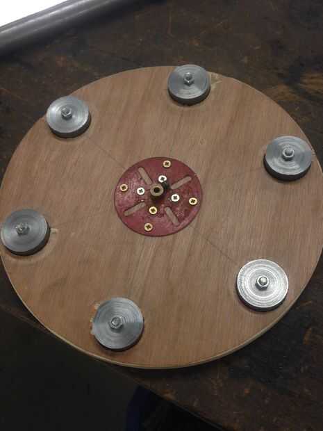 Grande (15mm de espesor) babosas acero cortadas de acero amplia barra fueron empernadas encendido en los agujeros. Esto dará el volante de un gran momento de inercia y suavizar el movimiento de la bomba. Tenga cuidado con estos volantes, como almacenar mucha energía en rotación puede fallar si hay un atasco en la máquina, o para de repente.