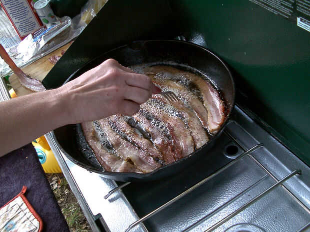 En el río que obtenemos grasa de tocino. Los huéspedes de viaje amor tocino - lo significa que generalmente estamos preparando libras de las cosas en cada viaje. Cada libra produce aproximadamente 1/4 a 1/3 de una taza de grasa, así que recoger toda la grasa que puedas hasta que ya tienes 2 tazas vale la pena.