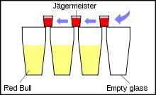 Línea de gafas de Red Bull con un vaso vacío en un extremo. Entonces necesita equilibrar cuidadosamente vasos de chupito de Jagermeister entre las llantas de un par de vasos de cerveza mientras avanzas a lo largo de la línea. Esto toma un poco de ensayo y error, pero la idea es que cuando se coloca correctamente los vasos solo empujas uno para crear un efecto domino de disparos cayendo en vasos de Red Bull! (Ver Video abajo)