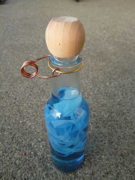 Las medusas son bastante fáciles. Cortar un círculo en el plástico. Creo que una buena longitud para R2 es la altura del nivel del agua en la botella. Esta longitud permite los tentáculos colgar bajo pero no toque la parte inferior. El radio del círculo interior controla el tamaño de cabeza de Medusa, con la línea de puntos es donde se atará. Atar la cabeza de la medusa con cadena. Usted necesita dejarlo lo suficientemente flojo como para llenar con agua. He utilizado una pajita al atar la cabeza porque la apertura de mi botella era muy pequeña por lo que necesitaría llenar después de consiguiera en la botella. Al cortar los tentáculos hice mirada algo rizado y algo estrecho para agregar a la visual de la misma. A continuación, había pegado a la medusa en la botella y llena la cabeza de aire primero, luego algo de agua. Después salió la paja le pongo agua en la botella el nivel quería y añadió una gota de colorante azul. La foto que se muestra es a medio camino después usé algunos latón y alambre de cobre para hacer un collar para la botella.
