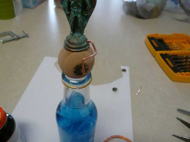 Ahora para la diversión parte que también es la más larga. Empecé a decorar la botella añadiendo la estatua griega a la parte superior. Tenía algún sentido en la parte inferior, que tuve que cortar primero, y luego presentar a la parte inferior para hacer una superficie de buena adherencia. Usé pegamento de uñas líquido a la estatua en la tapa del palillo. Mi adición siguiente fue el alambre de cobre que yo para seguir las líneas de la estatua y la tapa. Utiliza los alicates para formar el alambre y perforó un agujero en la base de la estatua, al lado de la tapa y el medio o una tapicería de uñas que interrumpió el punto. Entonces yo había asegurada todo con pegamento.