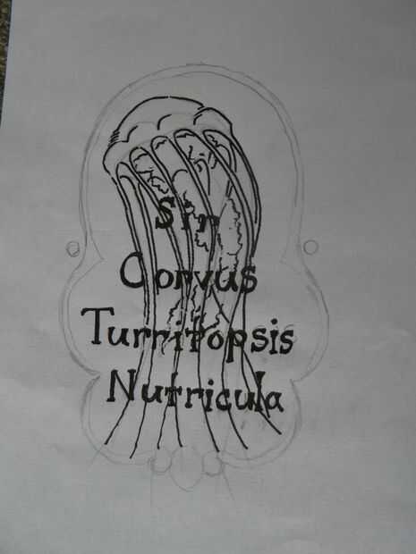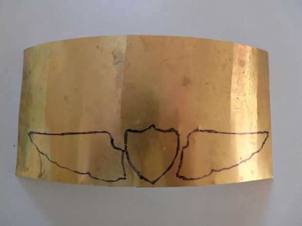 Después de que seque I mezclado pintura negra con agua para hacer un lavado y había pintado sobre las alas. Después de unos segundos se limpió el ala con una toalla de papel para dar a las alas un aspecto envejecido. El último paso fue pintar el cameo de cuervo sobre la porción de protector de las alas.