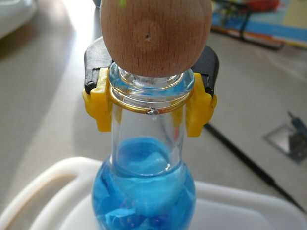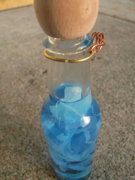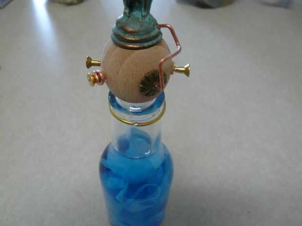 Continué la decoración de la tapa con tornillos de tres sujetadores que puse en la tapa. Incluso llamó algún exceso alambre de cobre alrededor de uno de los tornillos. Usé pegamento para asegurarse de que no caiga. Ya había añadido el cuello a la botella pero fui preocupado por la brecha en el alambre de cobre amarillo expandir y soltar la botella. Para asegurar el collar soldadas los dos extremos del alambre de cobre amarillo juntos. Este paso es opcional y sería el paso más avanzado en el proceso.