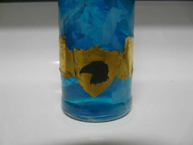 La parte final decorativa que agregué fue algunas alas de latón con un cameo de raven en él. Usé mi plantilla de papel para asegurarse de que tenía el tamaño adecuado y la ubicación. He copiado la plantilla en mi hoja de latón con un rotulador. Después de cortar las piezas (en tres piezas para mejorarlo wrap), puse las tres piezas en un pedazo de cinta. Usé la cinta para guardar cada parte en su posición relativa. He añadido pegamento a la parte posterior de las alas y ponerlo en la botella. Usé más cinta envuelve la adición de cobre amarillo todo en cinta para mantener el color de las piezas a la botella como se secaba.