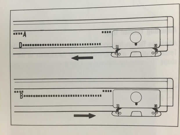 A continuación, mueva lentamente el carro de derecha a izquierda a través de las agujas. Usted verá las agujas moverse desde la posición inicial de la D a la posición B.