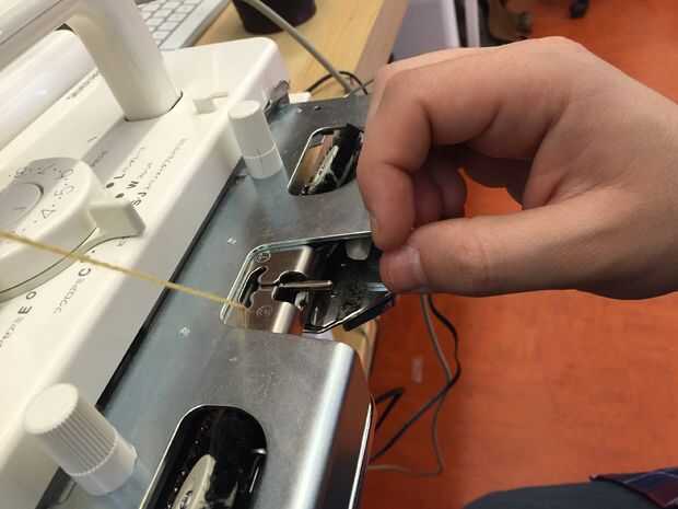 En el carro, abra la palanca de la puerta del alimentador de hilo (derecho está cercano, a la izquierda está abierto). Coloque el hilo como se muestra a continuación, cierre la puerta.