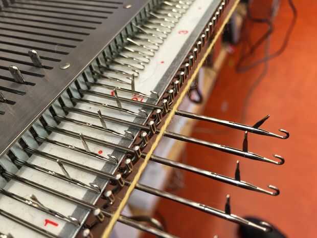 Tire el hilo debajo del brazo del carro y sobre de agujas en la posición D. A continuación, sujete el extremo del hilo tirando el carro a través de las agujas de izquierda a derecha hasta que haya pasado todas las agujas.