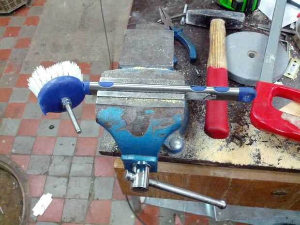 Corte el mango con una sierra de mano. Podría hacerlo al principio pero he encontrado que es más fácil de manejar el cepillo sin quitarla. La cosa a tener cuidado en este punto es dejar tan poco de la manija que se pega hacia fuera como sea posible.