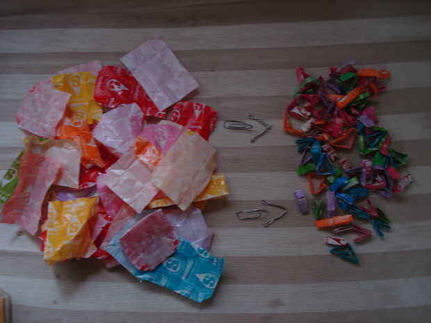 usted puede hacer fácilmente una cadena de contenedores starburst o goma de mascar. Estoy usando envolturas starburst desde hoy comí algunos, pero goma envolturas trabajo igual de bien.Acabo de hacer una cadena de un paquete de destellos, pero si tie