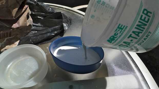 Este material establece muy rápidamente, así que uso su palillo para mezclar mezclar mezclar y obtener todos los terrones de la parte inferior lo más rápidamente posible y luego viértalo en los moldes.